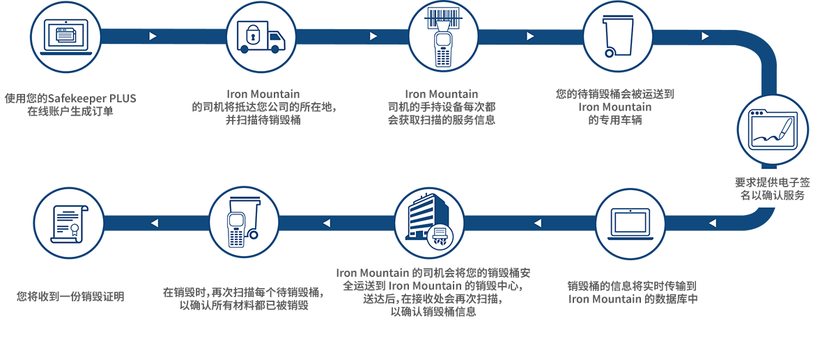 我们通过 InControl 技术在您的现场捕获待销毁资料的关键信息,包括条形码扫描、销毁桶容量捕获、电子签名以及时间/日期戳,从而实现对您的敏感信息的控制,并确保保管链的安全。