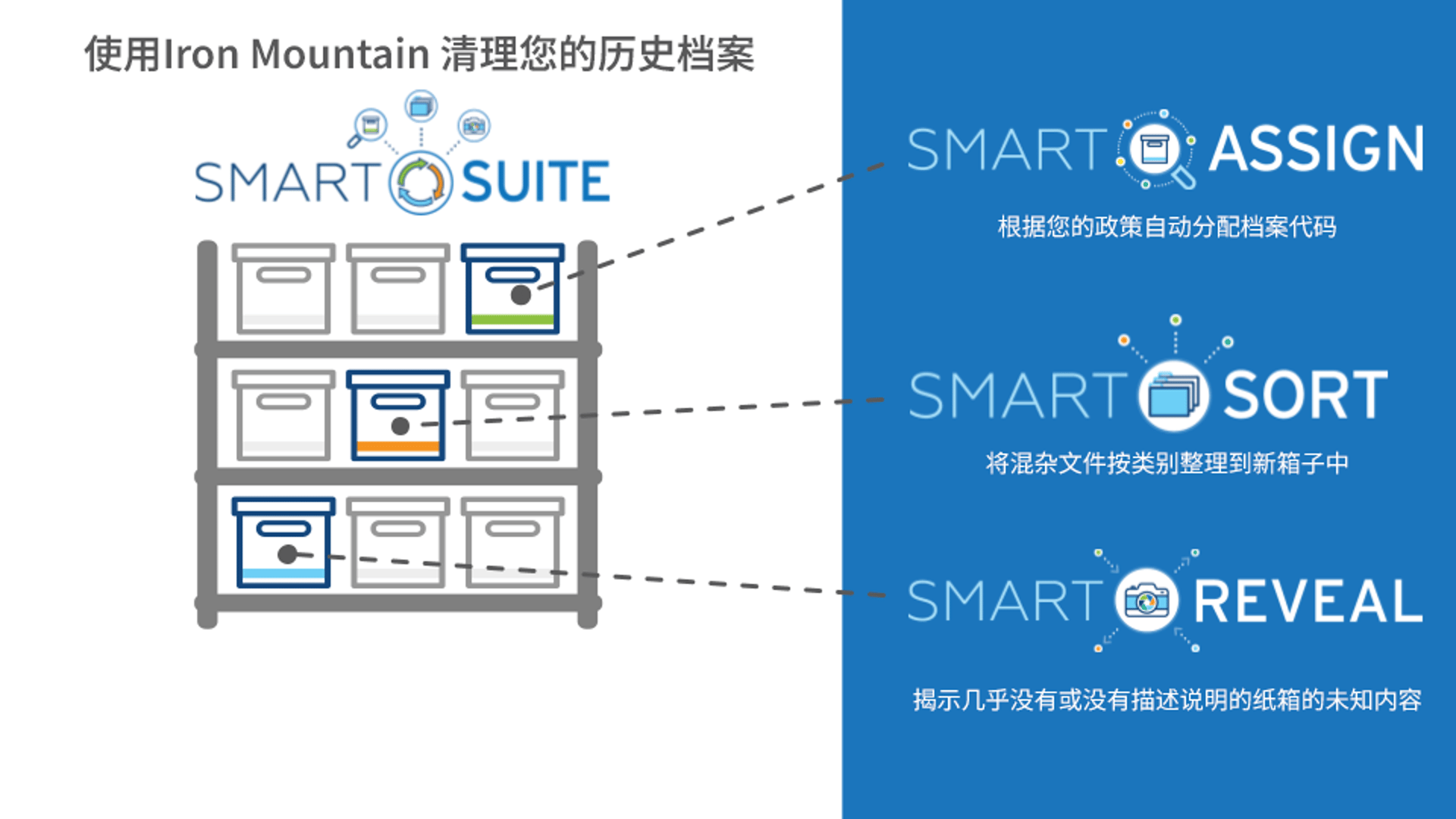 是技术驱动型解决方案的整套方案,能够大规模地自动简化、分类和组织您的档案库存,无论您存储的数据量有多大,也不管这些数据位于何处,帮助您明智地决定哪些档案需要保留、哪些需要安全销毁、哪些需要数字化。